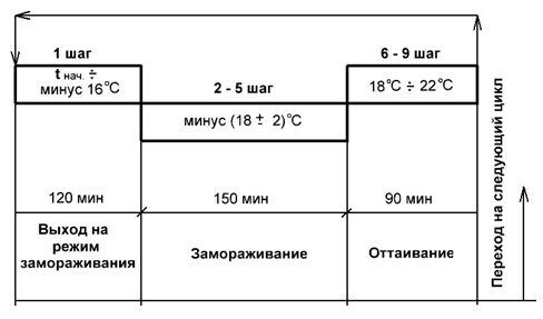 Цикл замораживания образцов разделен на 4 различных для разных образцов шага в целях обеспечения необходимой температуры замораживания и достижения оптимальной максимально возможной равноресурсной работы холодильных машин, а именно: