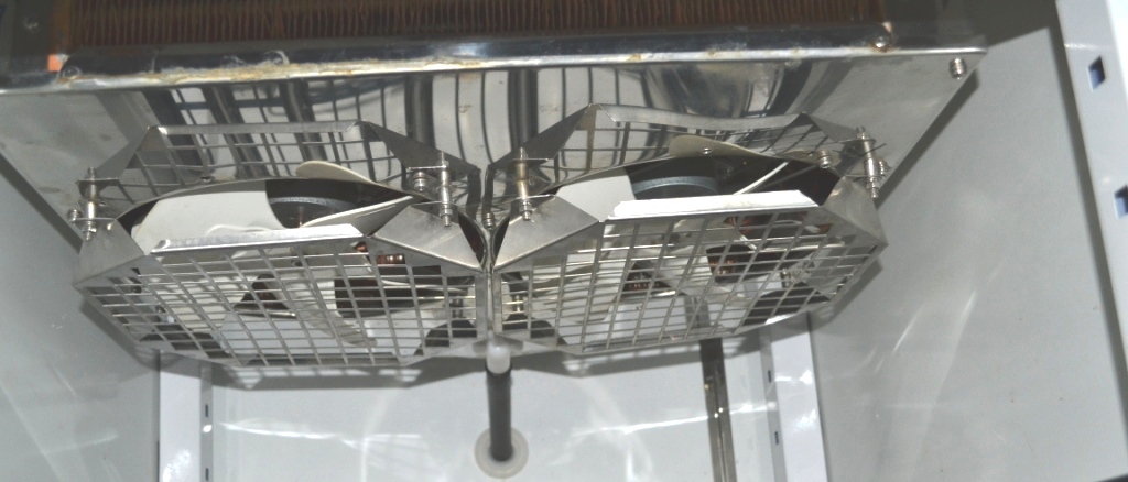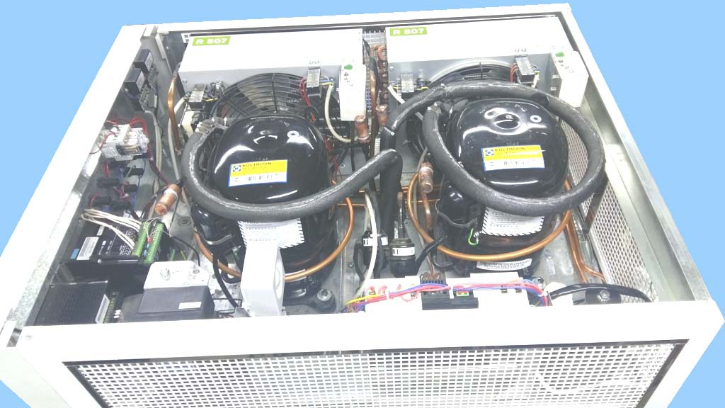 2. холодильная система камеры в современной версии состоит из комплекта 2-х гидравлически независимых холодильных машин, управляемых одним микропроцессорным контроллером по оригинальному алгоритму программы управления. Использование сдублированной холодильной машины позволило увеличить количество единовременно загружаемых в камеру образцов бетона до 24 шт. и максимально возможно увеличить производительность камеры, сократив до минимума общее время цикла замораживания за счёт быстрого достижения необходимой рабочей температуры воздуха - минус16°С.