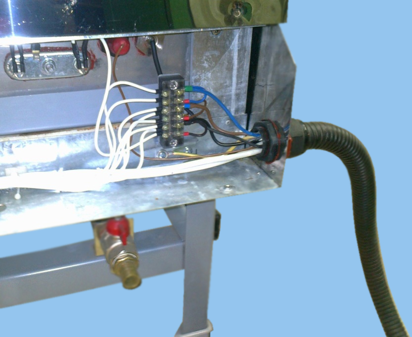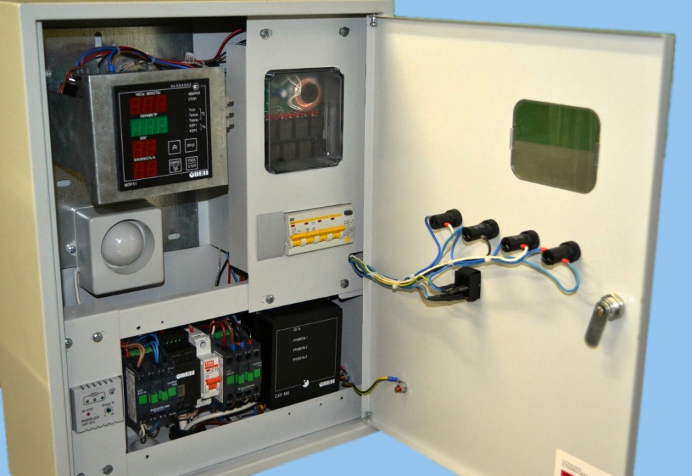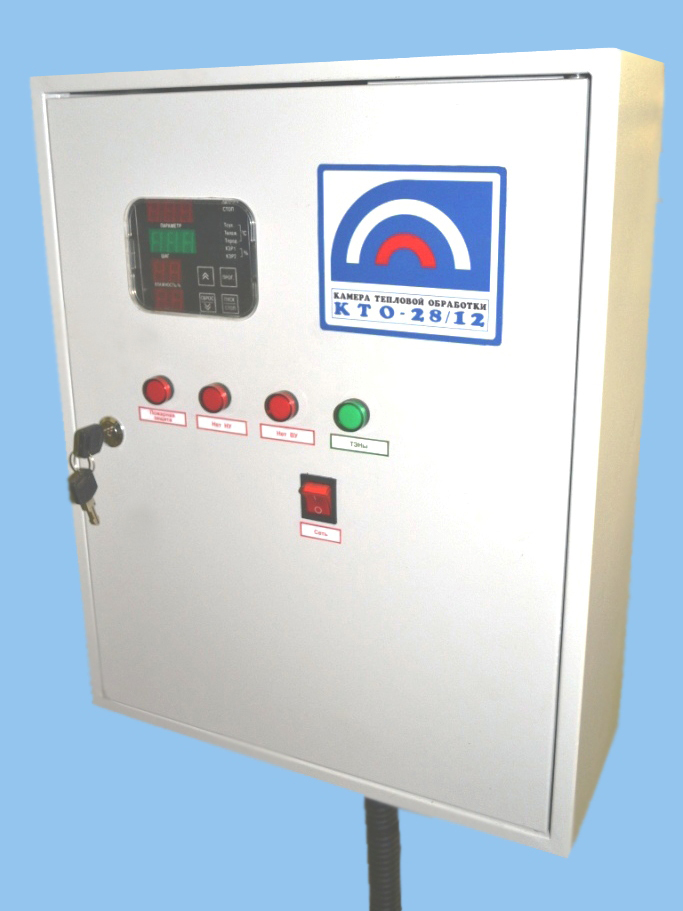 Пульт управления укомплектован пускорегулирующей аппаратурой, микропроцессорным измерителем-регулятором температуры (подлежит поверке), устройством защитного отключения электропитания камеры при появлении опасного для персонала уровня воздействующего напряжения, устройством защитного отключения электропитания камеры для исключения пожарной опасности при перегреве из-за упуска воды, дисплеем визуального контроля температуры и др. При недостаточном минимальном уровне воды в камере или при упуске воды (при снижении уровня воды в камере ниже датчика уровня воды) по любой из причин – выкипание воды при возможном отказе микропроцессора или датчика температуры, или по причине незакрытого сливного вентиля предусмотрена блокировка подачи напряжения на ТЭНы камеры с помощью сигнализатора минимально возможного уровня воды. Сигнализатор уровня воды размещается в пульте управления камерой.